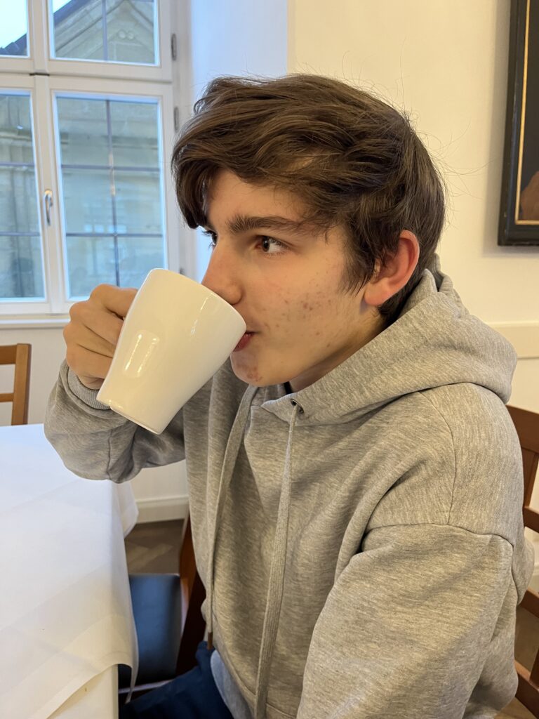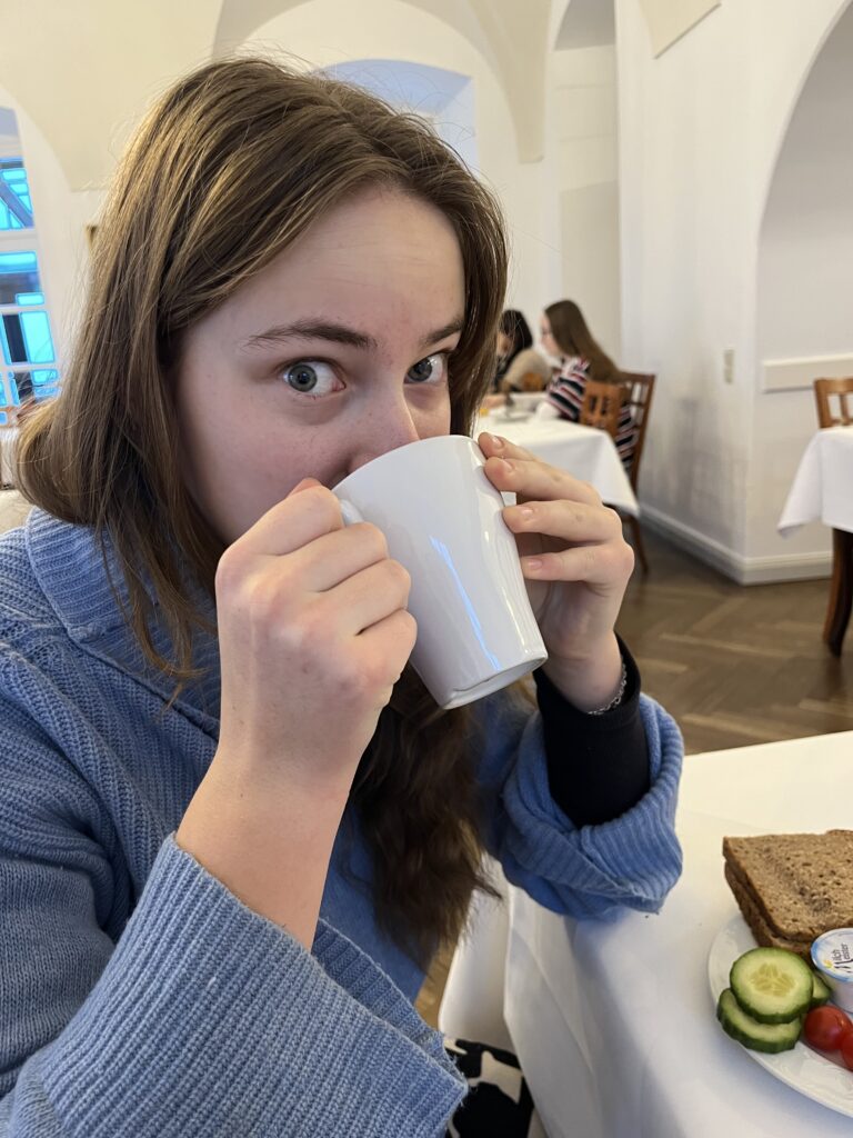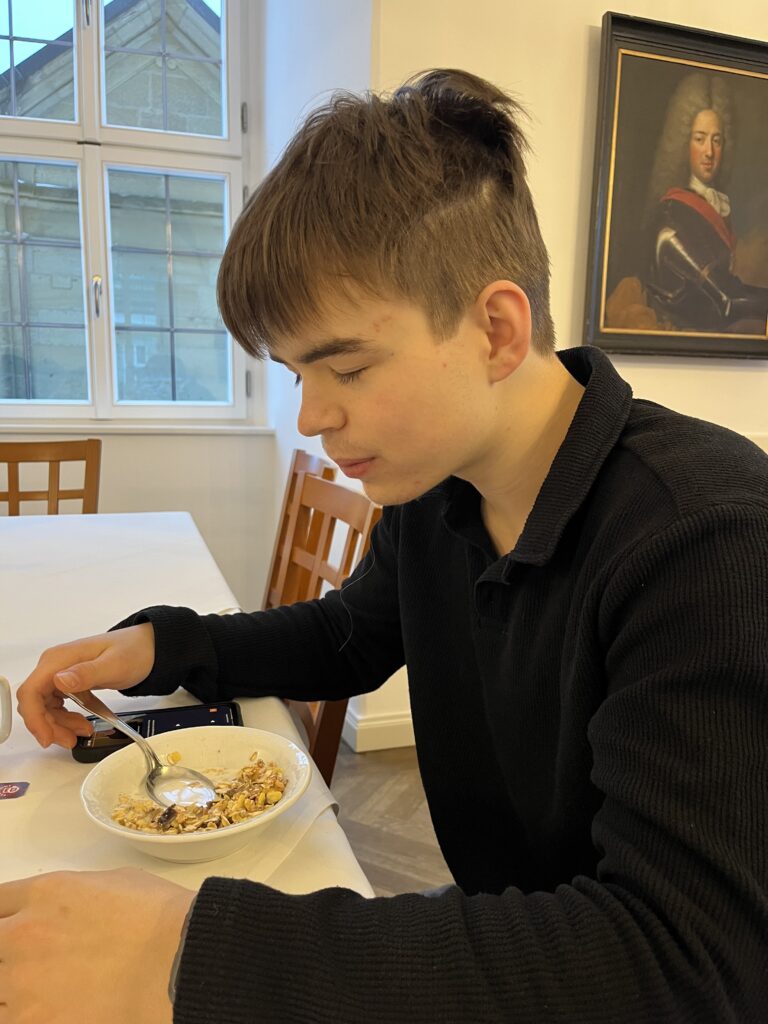 Die meisten haben sich schon ausgiebig an dem Frühstücksbuffet bedient. Von Joghurt bis hin zu gekochten Eiern ist alles mit dabei. Manche nehmen das sehr wörtlich und probieren sich einfach durch alles durch. Jetzt gehen alle gestärkt ins Seminar.