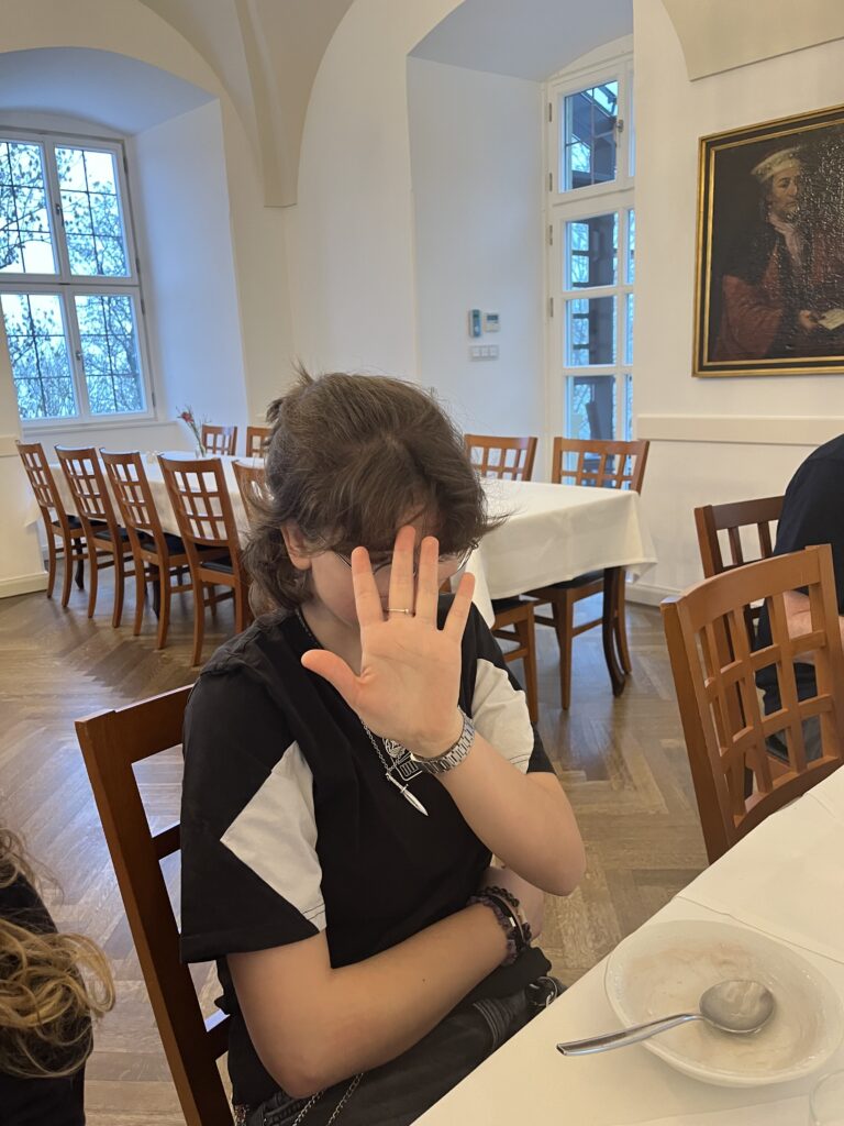 Nachdem wir einiges über Recherche und die Rolle von Interviews gelernt haben, begeben wir uns wieder auf die Wanderung zum Speisesaal. Inzwischen schaffen wir es auch ganz ohne uns dabei zu verlaufen. Dort erwartet uns schon der schön gedeckte Tisch und nach kurzer Zeit wird auch schon das Essen gebracht.