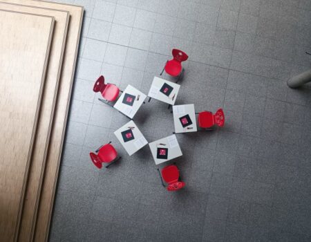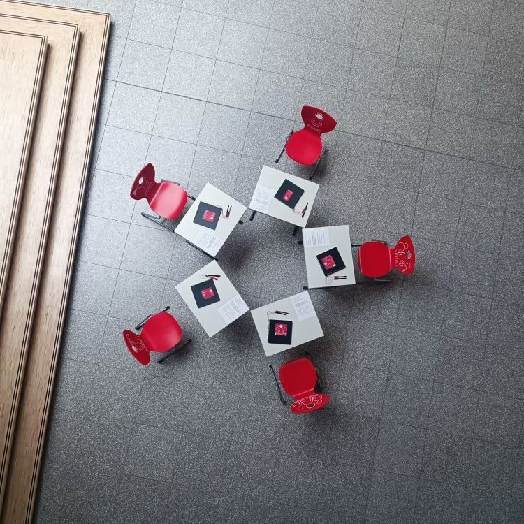 Die Stühle werden an einer Sitzgruppe in der Aula platziert werden. An den Tischen der Sitzgruppe liegen Bücher mit leeren Seiten aus. Jede und jeder von Euch ist herzlich eingeladen, seine Gedanken und Ideen zu den einzelnen Leitgedanken einzutragen und zu gestalten.