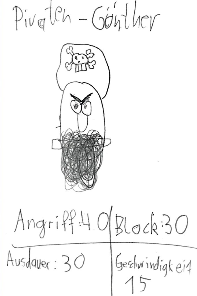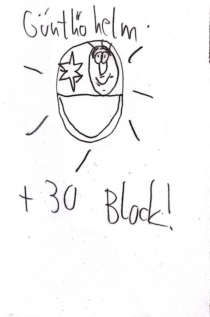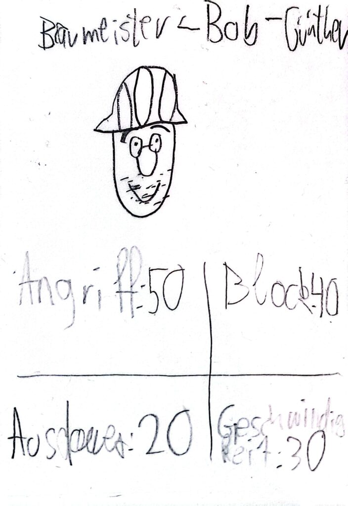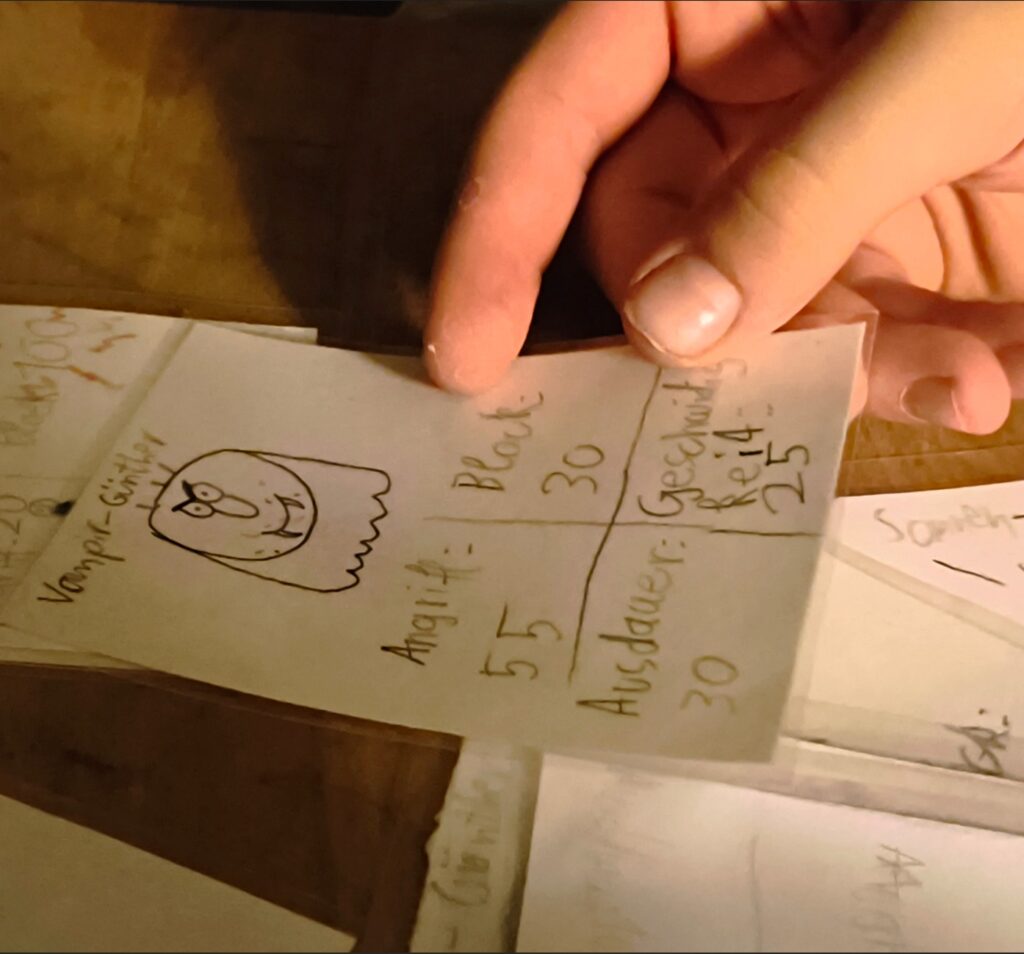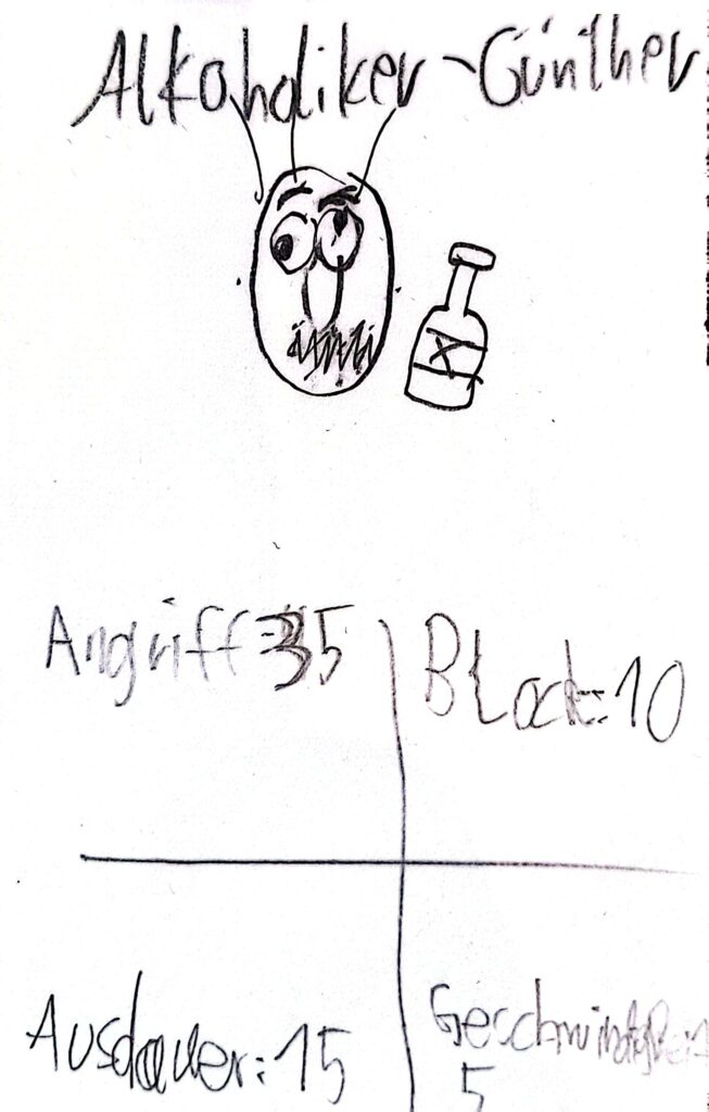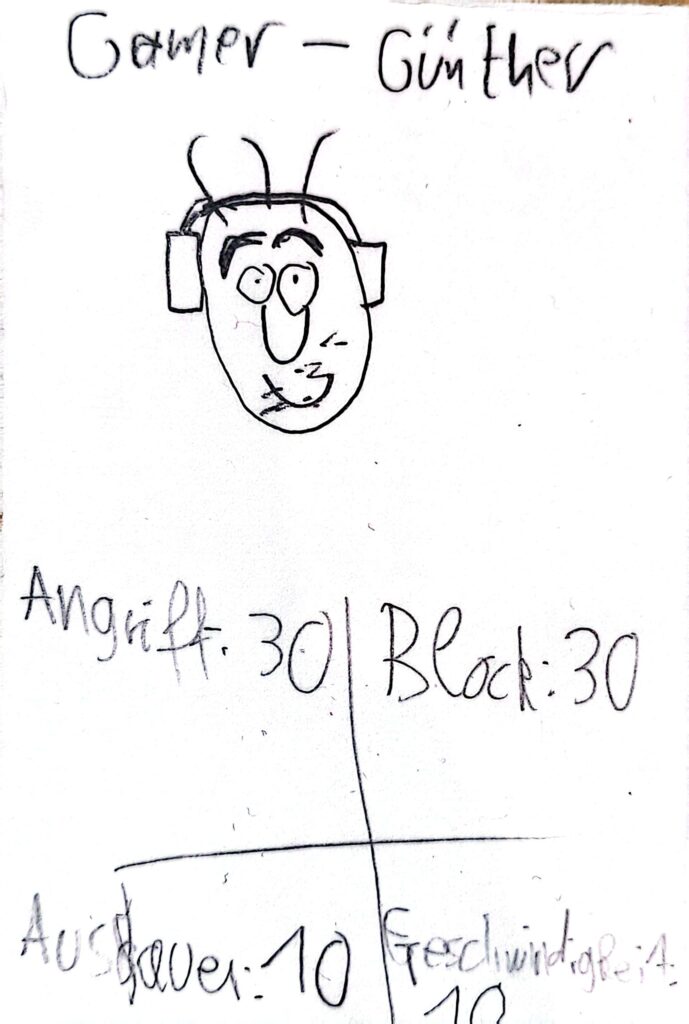 Nun kann man abwechselnd mit Angriff oder mit Ausdauer eine der verdeckt liegenden Karten angreifen. Wenn man einen höheren Angriff hat als der andere Block, hat man ihn besiegt. Dann wird die Karte auf einen Friedhofsstapel gelegt. Das gilt aber nicht, wenn der angegriffene Günther eine höhere Geschwindigkeit hat, dann kann er wegrennen. Wenn Günther aber mit Ausdauer angreift, muss der Verteidiger mit seinem Ausdauerwert blocken und kann nicht wegrennen.