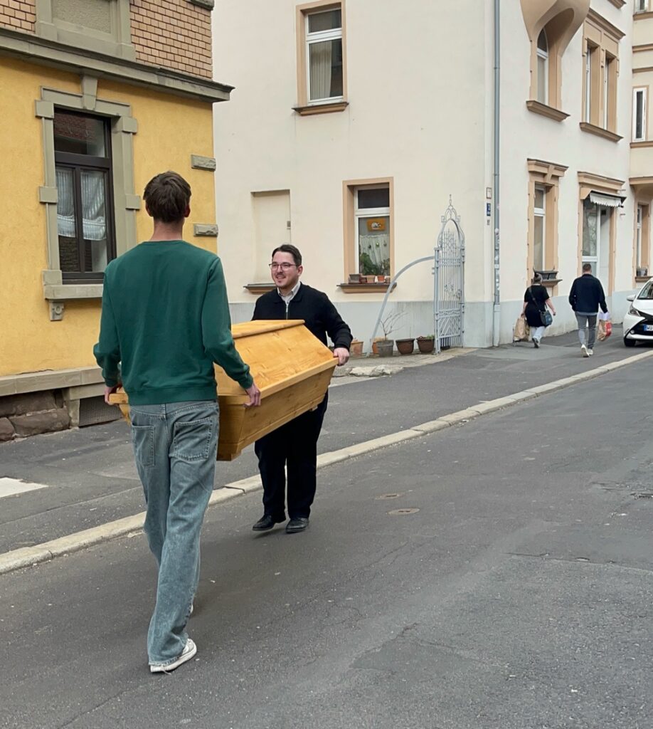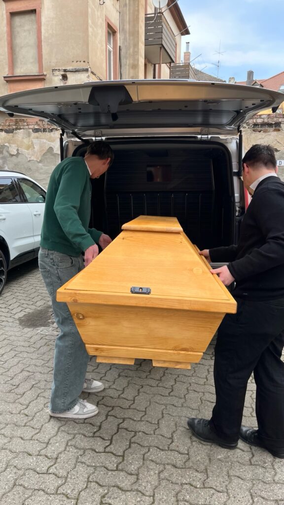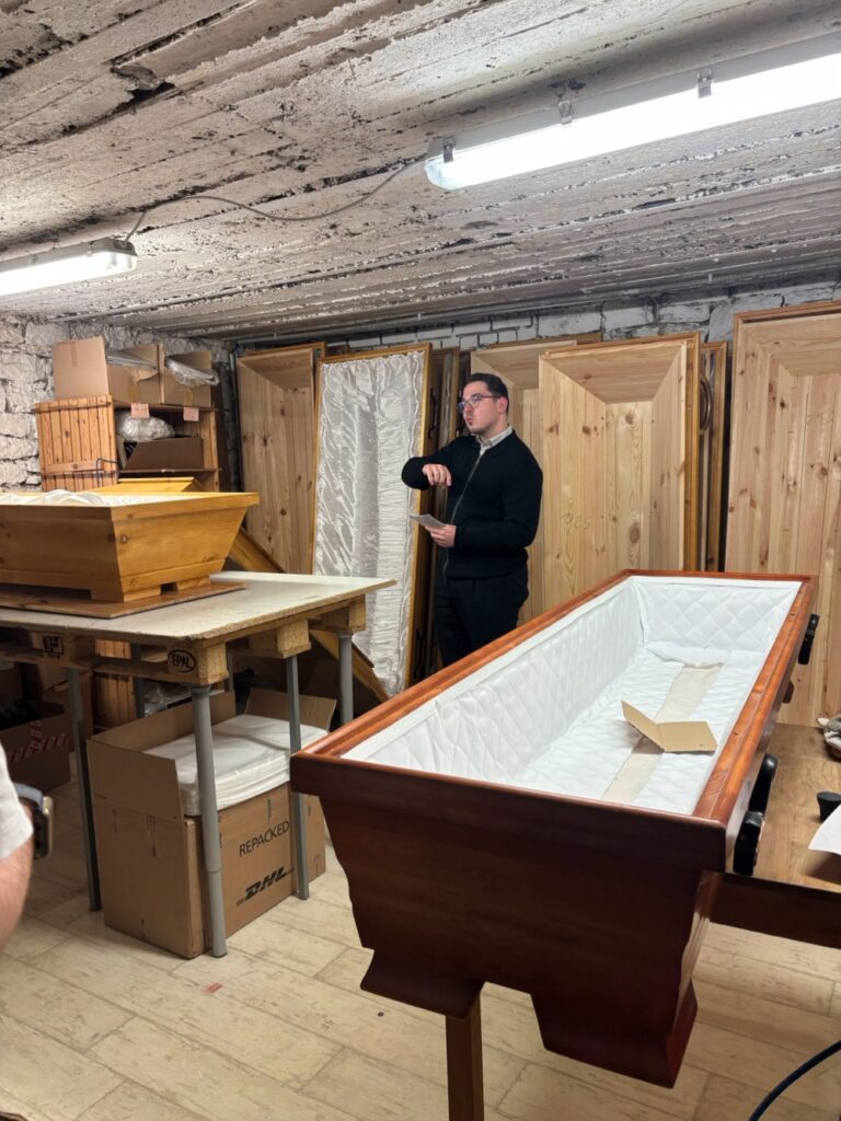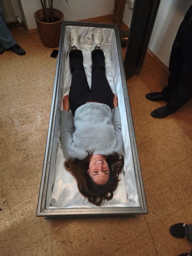 Vom Papierkram bis zur Präparierung der Särge war alles dabei. Nicolas, ein Angestellter von Herrn Papke, erklärte uns ausführlich die Abläufe im Betrieb und stellte sich unseren Fragen. Außerdem durften wir selbst Hand anlegen und einige Tätigkeiten ausprobieren – zum Beispiel das Vorbereiten eines Sarges sowie den Transport eines Verstorbenen – natürlich ohne einen echten Verstorbenen.