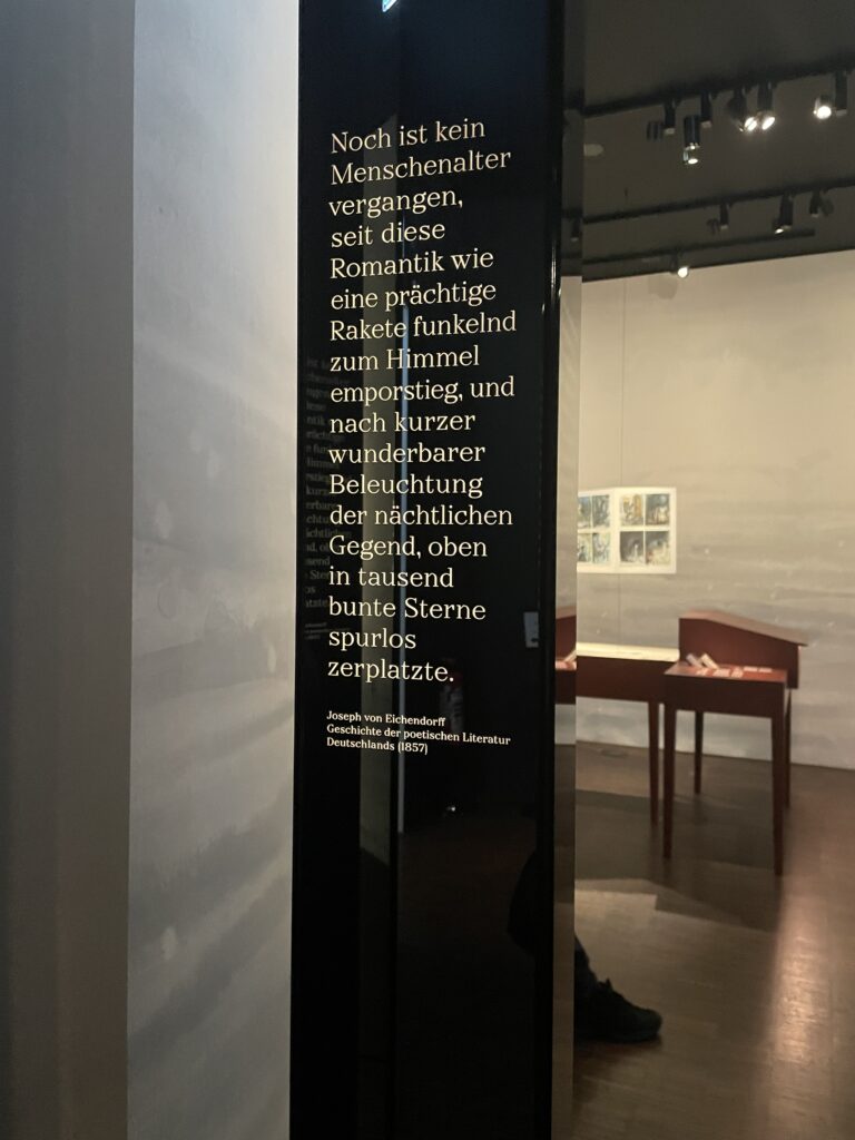 Die Epoche der Romantik stellt den Menschen und seine Gefühlswelt in den Vordergrund. Es geht um die Potenzierung des Seins, weshalb auch die Leidenschaft und Einbildungskraft eine besondere Rolle spielen. Die Ausstellung führt zunächst durch die Frühromantik mit ihren bekannten Vertretern, wie Novalis, Tieck oder auch Caroline Schlegel und zeigt ihre zentralen Merkmale, wie Sehnsucht, Naturverbundenheit und das Magische auf. Auch die Hochromantik, die sich durch Märchen und einem Nationalbewusstsein ausdrückt, wird näher beleuchtet. Der Dichter Joseph von Eichendorff prägte diese Zeit beispielsweise aktiv mit seiner Lyrik mit. Die letzte Phase der Romantik stellt die Spätromantik dar. Ihr Fokus liegt vor allem auf dem Unterbewussten und dem Unheimlichen. In dieser Zeit entstand auch der Roman „Frankenstein“ von Mary Shelly, der auch in der Exposition vorgestellt wird.