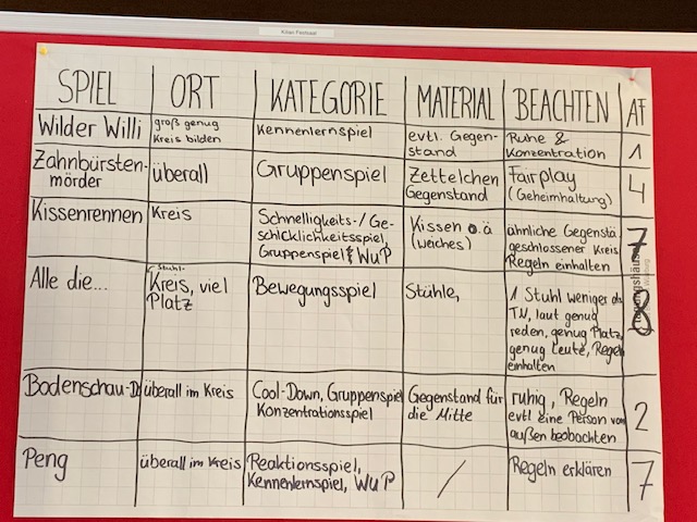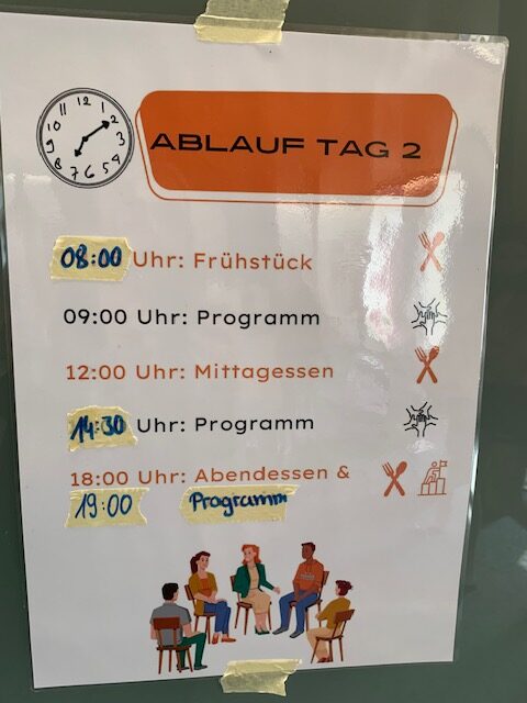 Der Morgen begann mit einer Putzrunde, denn unsere Zimmer mussten Abreise fertig gemacht werden. Entspannt vom Frühstücksbuffet machten wir uns fertig für die kommende Abreise, bis plötzlich der Feueralarm anging und wir das Haus verlassen mussten. Zum Glück war es nur ein Probealarm 🙂 . Danach brach die letzte Stunde unserer Tutorenschulung an. Nach ein paar letzten Spielen und der großen Feedback-Runde, war es für uns bereit. Die Abreise stand an. Die Fahrt zurück war sehr angenehm und wir freuen uns schon jetzt auf das kommende Schuljahr mit den neuen 5. Klässlern.