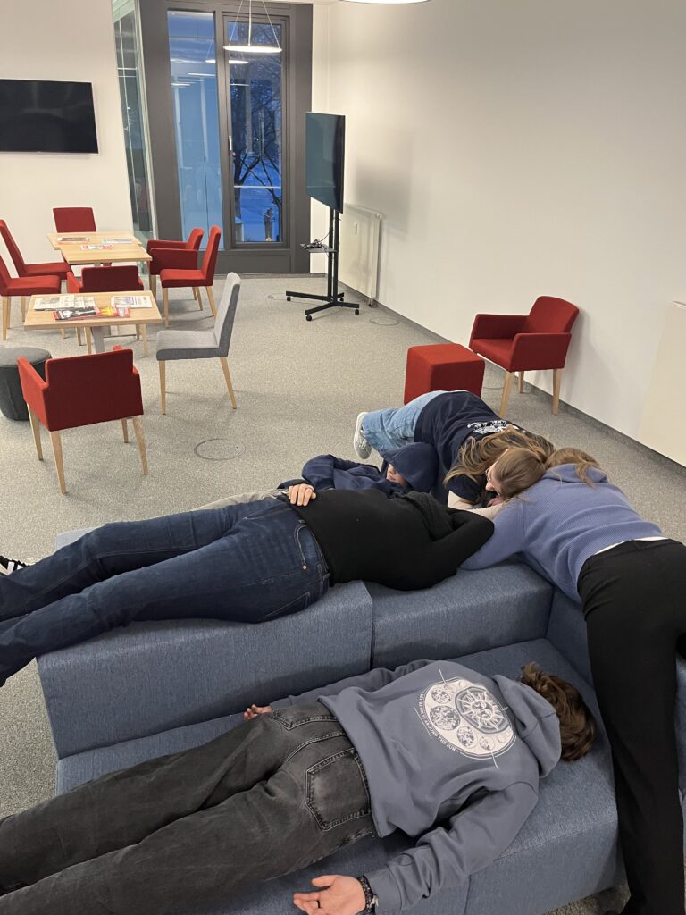 Wir sind etwas durch, deswegen ein kurzer Powernap auf dem gemütlichen Sofa der Akademie.