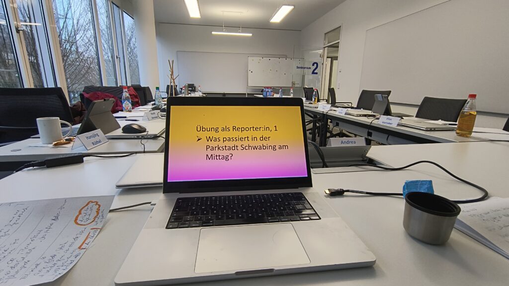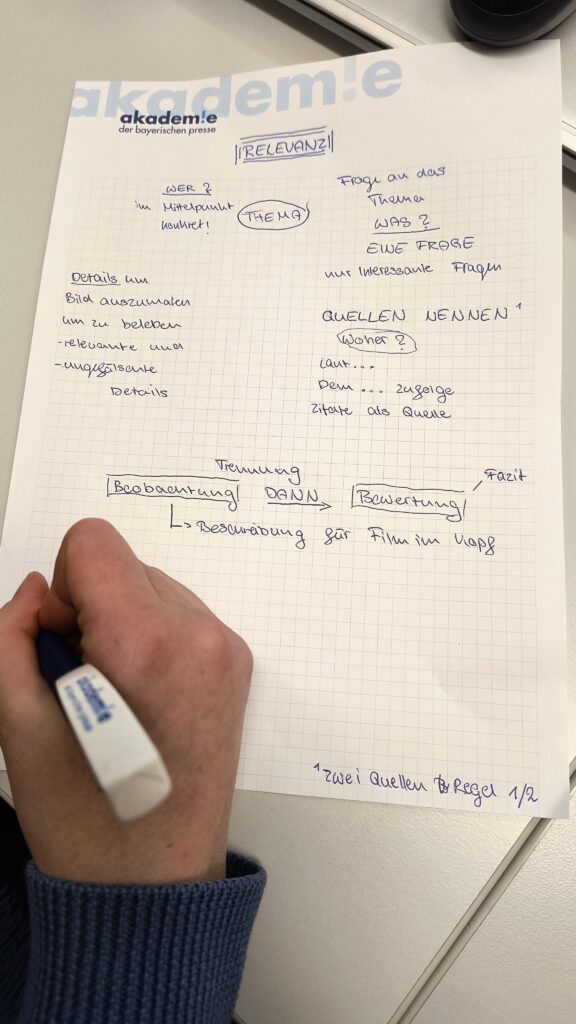 Unsere Herzen sind aber schon gewonnen, als wir Brezen und Süßigkeiten bekamen. So einfach sind wir strukturiert. Aber danach lernen wir einander erstmal kennen. Unsere Dozentin Andrea Mertes ist eine sehr interessante Frau, die selber als Journalistin selbständig gearbeitet hat, nun aber schon seit einiger Zeit, Schulungen durchführt. Als wir über uns reden, merken wir, was für interessante Themen eigentlich noch vor unserer Nase liegen. Wir lernen schon dadurch viel, besonders interessant wird es aber, als unsere sehr freundliche Dozentin ein bisschen unsere Zeitung analysiert. Sie erinnert uns daran, dass wir noch mehr an unsere Leser denken sollen und dabei im Blick haben, was für die interessant ist. Mehr Fokus wird angemahnt, das Zauberwort heißt RELEVANZ. Was das heißt? Was ist nützlich, was ist gerade aktuell, was spricht unsere MItschüler an! Zur Seriosität gehört es auch, immer die Quellen anzugeben. „Das muss nicht plump sein mit den Fußnoten, man kann das auch einfach im Text mit Anführungszeichen machen“ meint unsere Dozentin (sinngemäß). Insbesondere bei heiklen Aussagen, die man sich nicht zu eigen machen will, ist da seine gute Technik, um sich abzugrenzen.