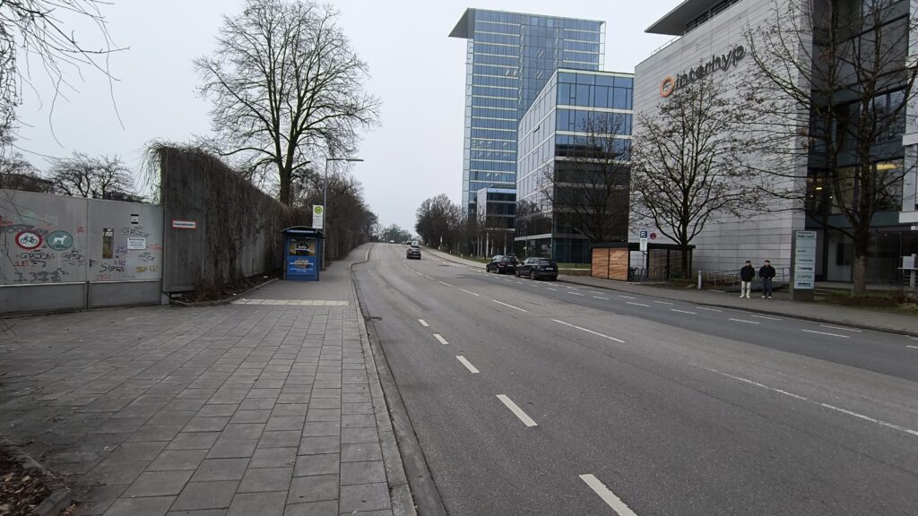 Steinfassade, Platten, Glas, Stahl, großartiger Eingang, 3 Leuchten wie Überwachungskameras. Daneben ein Baum, eingefasst in einem Kreis aus Rost ein Baum. Die Blätter haben die gleiche Nicht-Farbe. Karg. Auf der anderen Straßenseite eine Gitterwand. Darin ein Tor wie in einen Gefängnishof. Dabei ist es eine Kleingartenanlage. „Geöffnet“ steht da groß, aber es ist geschlossen. Auch vor „Einbruch der Dunkelheit“. Ein Bus kommt. Tür auf, einer rein, zwei raus. Auch auf der anderen Seite. Laut röhrt der Diesel beim Anfahren. Eine Frau hastet vorbei, blanke Lederstiefel. Setzt sich in die Bushaltestelle. Der Fuß wippt, ungeduldig. Hat sie den Bus verpasst? Und dann und wann eine Betonmischer. Um noch mehr Beton zu bringen. Irgendwohin. Ein Radfahrer mit vielen Taschen, mit gleißendem Licht will er mitten am Tag auf sich aufmerksam machen. Viel Glück!