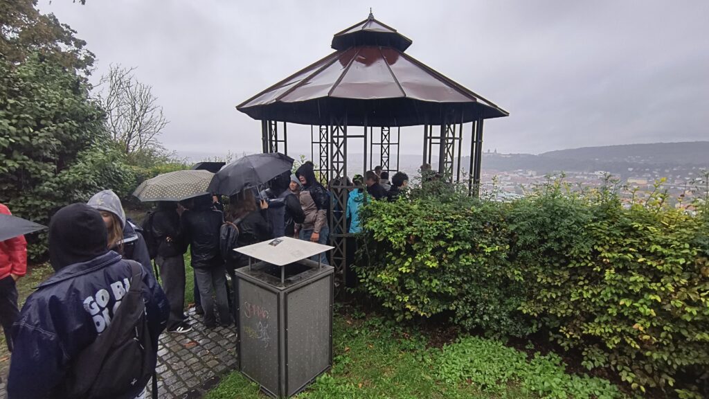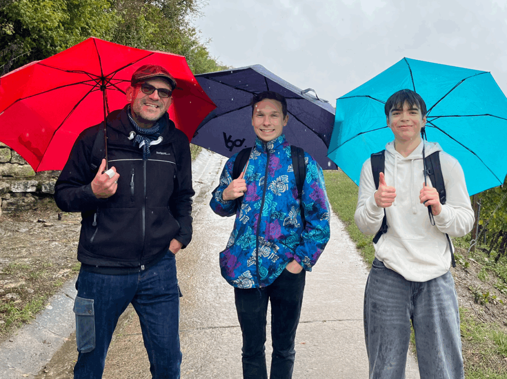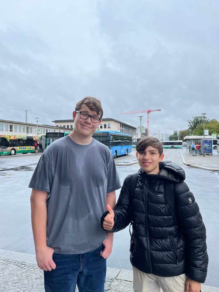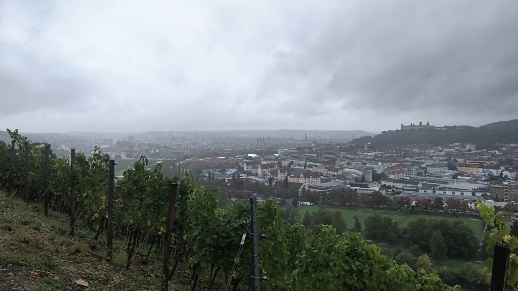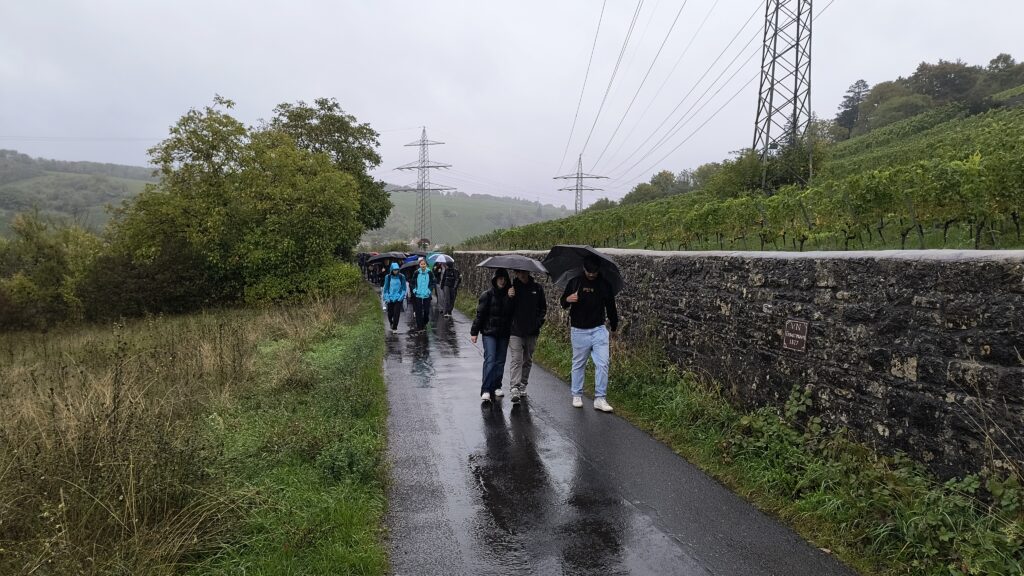 Mit größter Motivation startet die 11. Jahrgangsstufe um 8:30 ihre lange, regenreiche Reise nach Würzburg. Den Regen konnte bei diesem schwarzen Himmel natürlich keiner vorhersehen und die Wettervorhersage hätte ja auch falsch sein können. Schon nach kurzer Zeit werden die Klassen von dem unvorhersehbaren Regen erwischt. In beinahe blendenden Sonnenschein geht es weiter Richtung Würzburg. Die Meinungen zum Regen variieren. Manche freuen sich über die Gartenbewässerung, andere sehen diese „Extremerfahrung“ kritisch und liefern sich ein Gefecht mit ihrem Regenschirm.