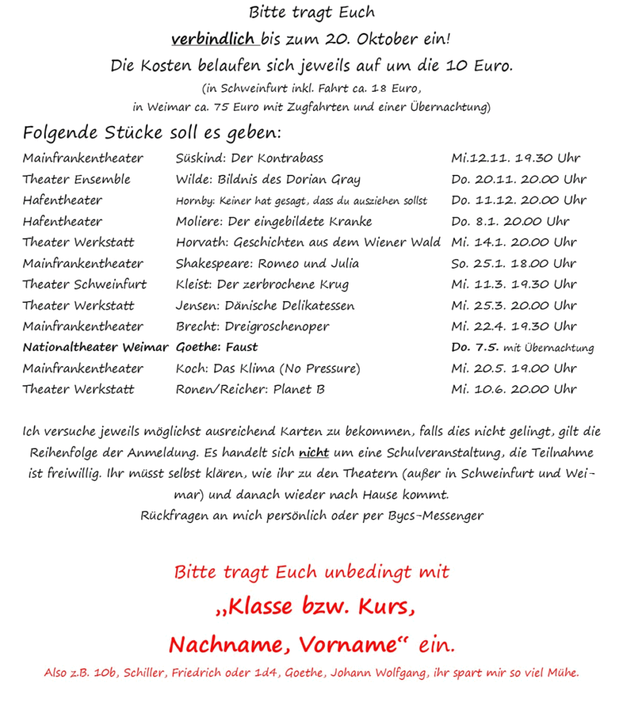 Seit nun 10 Jahren gibt es am Gymnasium Veitshöchheim ein Theaterprogramm für alle Schüler ab der 10. Klasse. Dabei dürfen sie sich am Schuljahresanfang individuell ein Programm aus ausgewählten Werken zusammenstellen. Diese werden im Folgenden vorgestellt, die Wahl erfolgt über einen Link, den alle Schüler der oberen Klassen über den Bycs-Messenger zugeschickt bekommen.