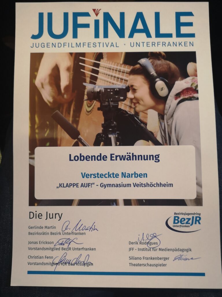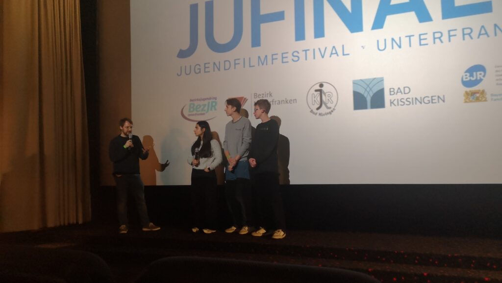Wir von der AG „KLAPPE AUF! für Demokratie und Kinderrechte“ durften Ende Oktober etwas ganz Besonderes erleben. Unser Film „Versteckte Narben“, den wir bereits im vergangen Schuljahr gedreht hatten, wurde für das Jugendfilmfestival JUFINALE ausgewählt und am 25.10.2025 im Universum Kino Palast in Bad Kissingen gezeigt. Es war ein unglaubliches Gefühl, unseren eigenen Film auf der großen Leinwand zu sehen!