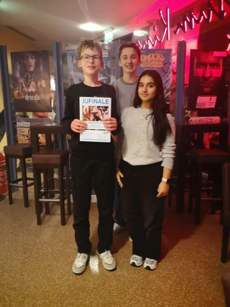 Nach einer kurzen Pause folgte die Siegerehrung. Die Jury lobte viele der gezeigten Filme und hob besondere Momente hervor. Auch unser Film bekam eine sehr positive Rückmeldung und wir wurden mit einer „lobenden Erwähnung“ ausgezeichnet. Als wir auf die Bühne gerufen wurden, waren wir richtig glücklich und stolz auf unsere Arbeit.