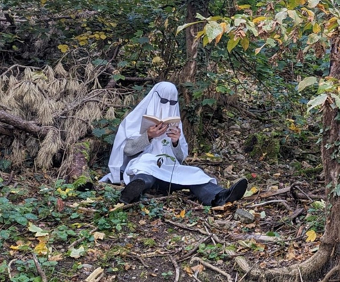 Schon der erste Blick auf dieses Bild sorgt für ein Schmunzeln – ein Geist, der seelenruhig im Wald sitzt und liest, darauf muss man erst einmal kommen. Und das passt natürlich einfach perfekt zum Hauptthema Halloween.