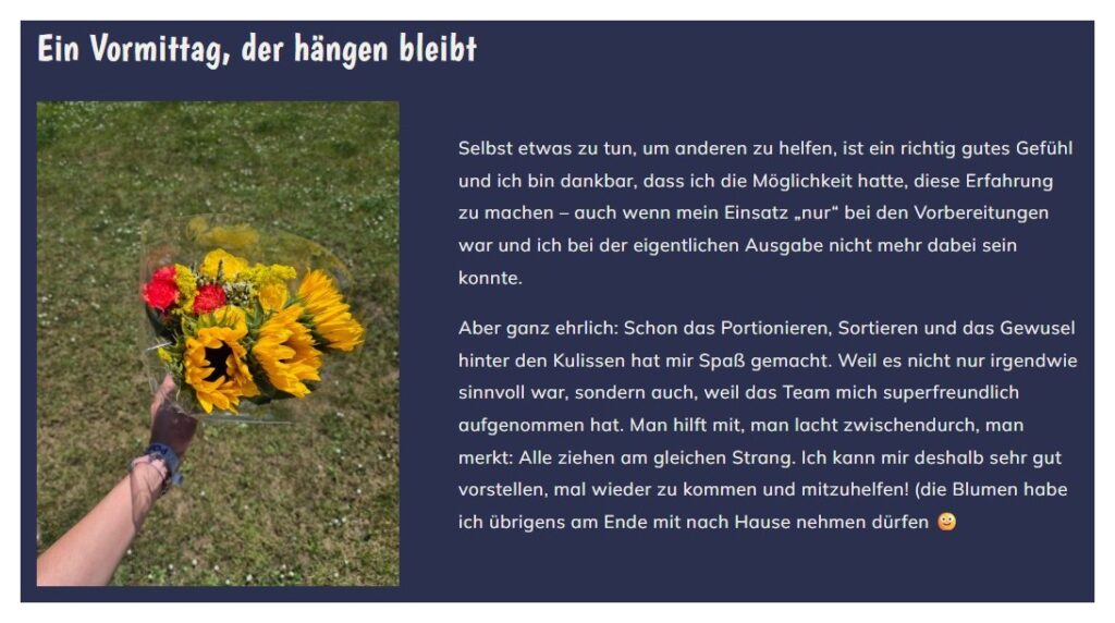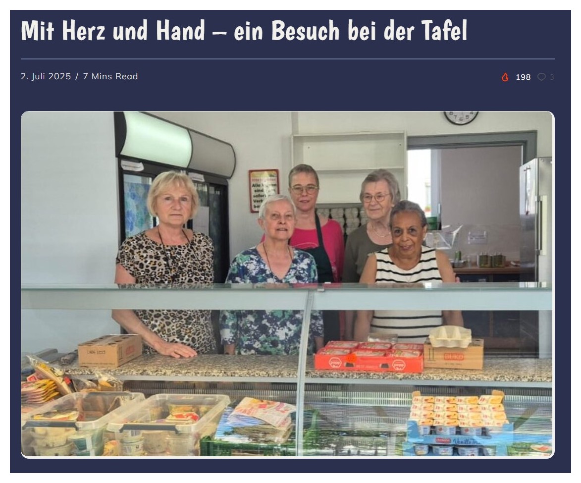 Die warmen Strahlen der Morgensonne streifen über den Asphalt, als ich am Eingang der Tafel ankomme. Es ist still- keine Kundenschlange, kein Stimmengewirr. Nur das dumpfe Poltern von Kisten, gefüllt mit Backwaren, Joghurt und Eiern, durchbricht die Ruhe. Drinnen greifen Hände zu, sortieren, wiegen ab. Ich bin mittendrin. Für ein paar Stunden werde ich Teil eines reibungslosen Systems, bei dem jedes Brötchen viel Wert hat. Und erst hier begreife ich, wie viel Organisation, Hingabe und Teamgeist es braucht, bevor die Türen überhaupt öffnen. Es geht um viel mehr als nur um Lebensmittel. Es geht um Geschichten. Um Menschen. Und um die stille Kraft des Gebens.
