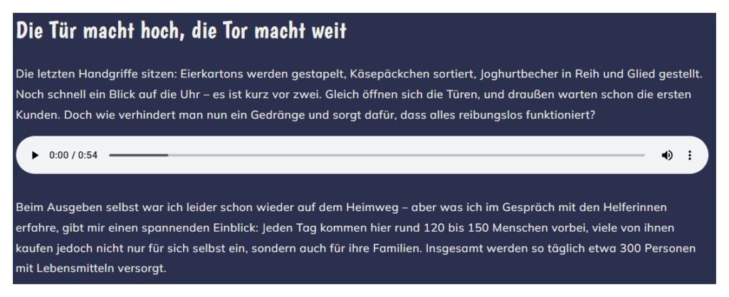 Um den Artikel interessanter zu machen, hat Finja verschiedene Medien genutzt. Wie unten erkennen könnt, haben wir nur Text und Bilder, sondern auch ein Tondokument. Genauso gut, könnt ihr aber auch (kurze) Videos hochladen oder Instagram, Youtube oder eine Playlist von Spotify verlinken.
