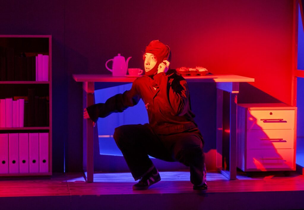 Vormittags ins Theater gehen, statt Schule zu haben, das ist natürlich cool. Leider kamen wir im Mainfrankentheater dann aber doch wieder in ein Klassenzimmer, noch dazu in ein eher karg eingerichtetes. Wir haben uns gleich heimisch gefühlt. Daneben gab es aber auch noch einen zweiten Raum, ein Büro. Das war schön eingerichtet, am besten fand ich die Wand mit den Bücherregalen. In diesem Zimmer hauste der Hauptbösewicht, von dem die Schüler eine wertvolle Beute gemopst hatten.