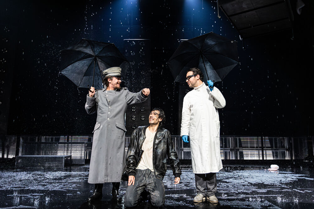 Eine Bühne im Dauerregen, der Tambourmajor in Netzhemd und enger Lederhose, die Frankenstein-Apparatur des Doktors, Marie in einem schwebenden Bett, das sich später in ein Floß und zuletzt in ein Grab verwandelt – die Inszenierung von Büchners „Woyzeck“ besticht vor allem durch ihre eindrucksvollen Bilder. Nicht ganz so begeistert hat mich die Sprache auf der Bühne: Während im Originaltext die Sprache extrem verknappt ist und jedes Wort ins Schwarze trifft, wurde auf der Bühne viel Text dazu improvisiert, teilweise auch eher läppische Sätze („Es ist okay, Woyzeck.“), die gar nicht zu Büchners expressivem Stil passen. Ausgeglichen wurde das durch den beeindruckenden Körpereinsatz der Schauspieler, der die Machtverhältnisse und die Leiden der Hauptfigur auch für die Zuschauer körperlich spürbar gemacht hat.