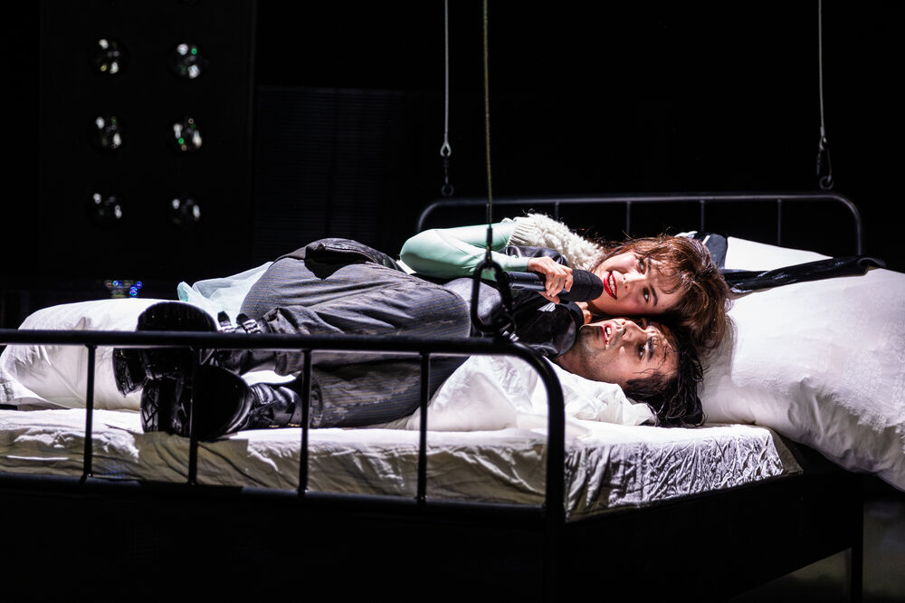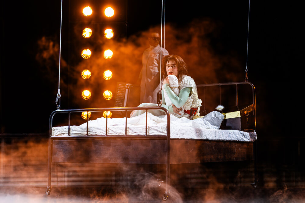 Überraschend war der Auftritt der Figur Marie, die das erste Viertel der Vorstellung in einem Bett, das in ein paar Metern Höhe über der Bühne hing, versteckt verbracht hat.