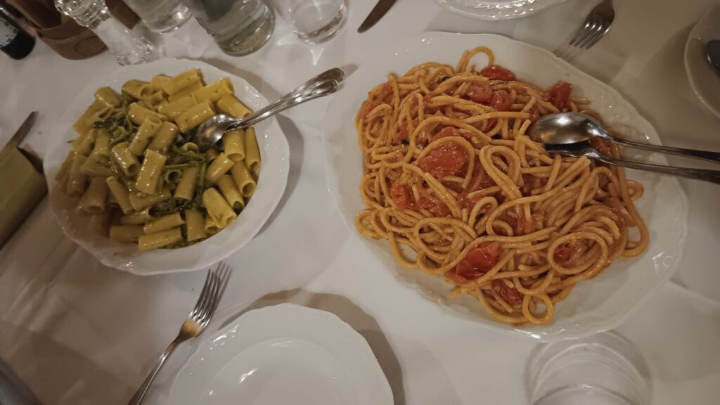 Es scheint als ob das Abendessen den Italienern sehr wichtig ist: es wird nämlich immer ganz schön aufgetischt. Und das in einer Zeitspanne von über 2 Stunden. Zu Beginn stand Gebäck auf den Tischen, das irgendwie salzig geschmeckt hat, aber unglaublich lecker. Danach kam die Vorspeise, bei der auch für alle etwas dabei war: von Salat bis Schinkenbrot. Und dann das Beste – Nudeln natürlich. Eigentlich dachten wir, es sind Spaghetti, nur waren sie viel dicker als bei uns. Und zum Schluss noch einen Obstsalat.