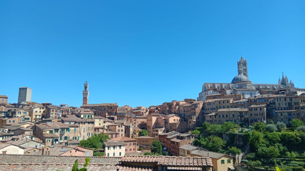 Auf dem muschelförmigen Marktplatz setzen wir uns, wie alle anderen auch, einfach auf den Boden und hören Madalena zu, wie sie etwas über die Geschichte der Stadt erzählt. Die Stadt wurde immer prachtvoller gebaut, um Florenz zu übertreffen, mit denen es öfters Konflikte gab. Innerhalb der Stadt gibt es neun Stadtteile, die alle auch ein eigenes Wappen haben. Noch heute gibt es einmal im Jahr einen Wettkampf zwischen den verschiedenen Teilen. Dabei dürfen nicht einmal Familien, deren Mitglieder ursprünglich aus unterschiedlichen Teilen stammen, in der Nacht vorher im selben Haus schlafen.