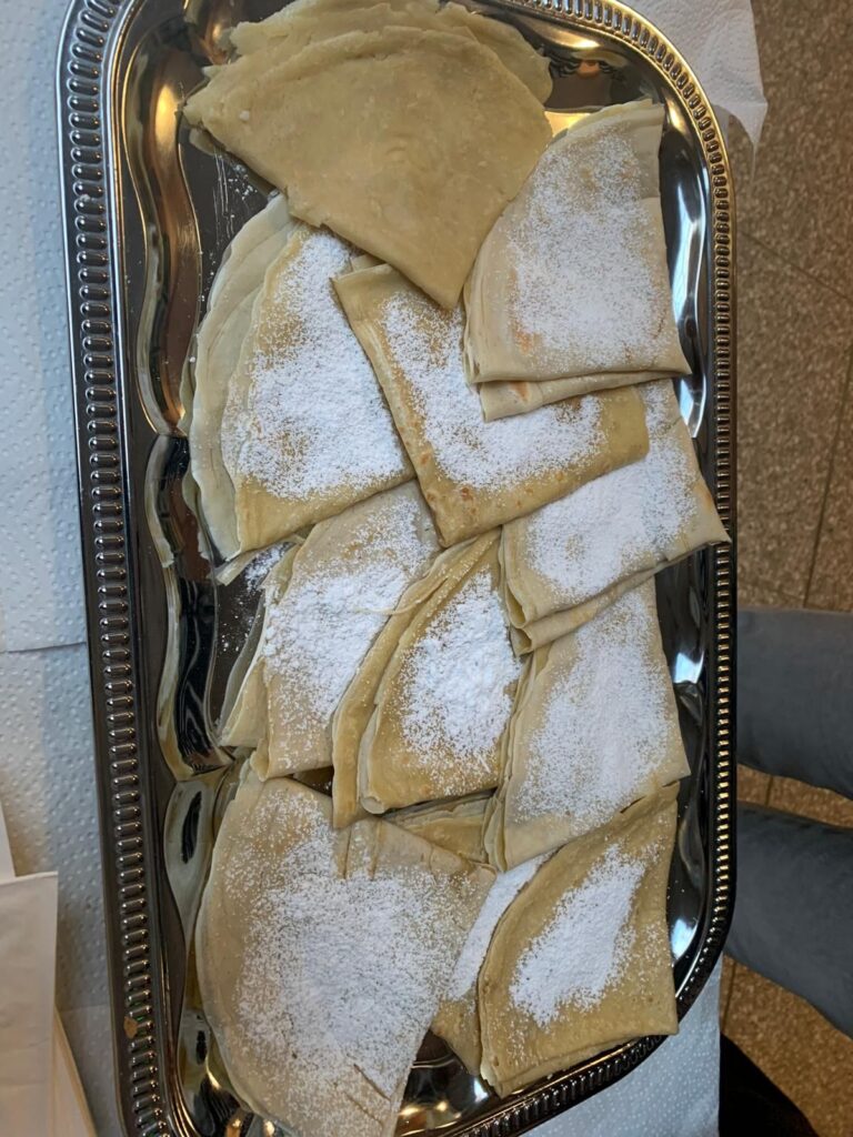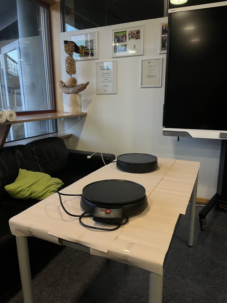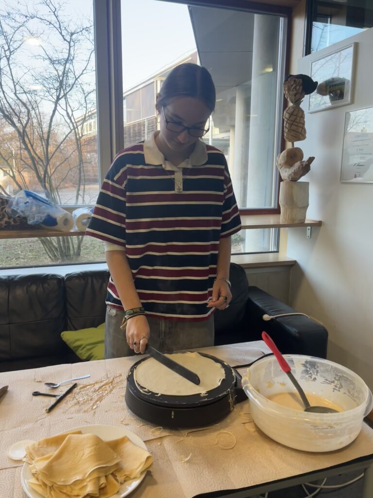 Obwohl wir dachten, dass wir viel zu viel Teig hätten, ging uns bereits nach den ersten beiden Stunden der Teig aus. Doch der große Ansturm in der zweiten Pause stand ja noch bevor! Also zogen einige von uns los um Eier, Mehl und Nutella zu besorgen. Nachdem die Zutaten bei uns angekommen waren, legten wir direkt wieder los und somit gab es auch in der zweiten Pause noch Crêpes für alle.