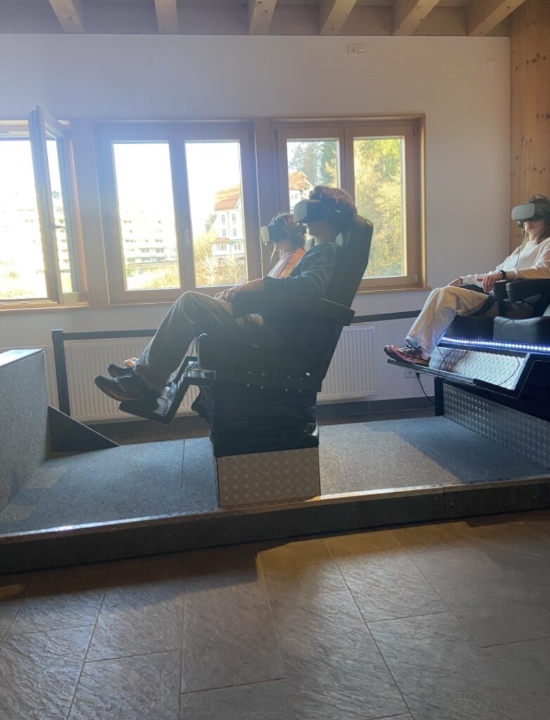 Der Nachmittag wurde dann technisch und futuristisch. Wir wurden in drei Gruppen von jeweils etwa ungefähr 17 Personen eingeteilt, um nacheinander verschiedene VR-Stationen auszuprobieren. Mithilfe von Virtual-Reality-Brillen tauchten wir in völlig neue Welten ein. An einer Station konnten wir das unendliche Weltall erkunden und uns wie echte Astronauten fühlen. Eine andere Station bot einen wunderschönen Ausblick über Triberg: Hier simulierten wir einen Fallschirmsprung, bei dem man das Gefühl hatte, tatsächlich durch die Luft zu gleiten. Wohingegen die dritte Station eine virtuelle Reise um die ganze Welt ermöglichte und unser Geschick in einem Hochseilparcours auf verschiedenen Kontinenten unter Beweis stellte.