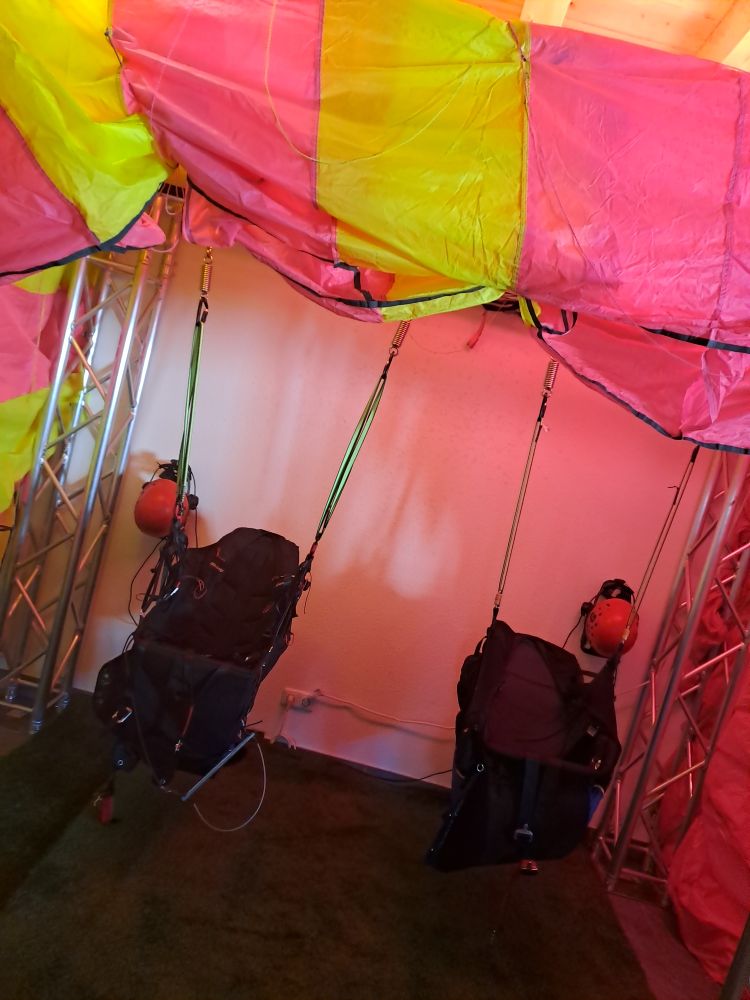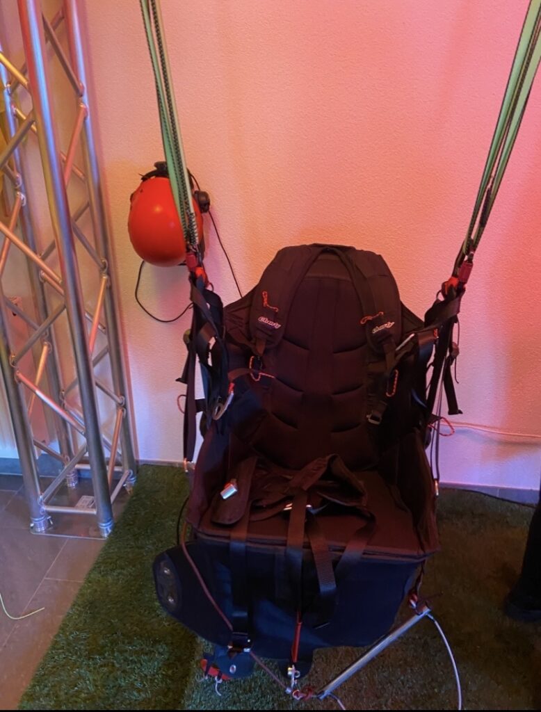 Pour l’activité suivante, notre groupe a été divisé en trois parties. Le premier groupe s’est rendu directement au musée VR. Là, après une courte introduction avec des lunettes de réalité virtuelle, nous avons pu regarder un film en 4D, faire un vol en chute libre simulé et traverser un parcours en hauteur. Le parcours en hauteur m’a le plus plu, car on pouvait bouger au lieu de rester assis sur une chaise comme pour les deux autres activités. Sur la photo, on voit à quoi ressemblait le saut en parachute vu de l’extérieur.