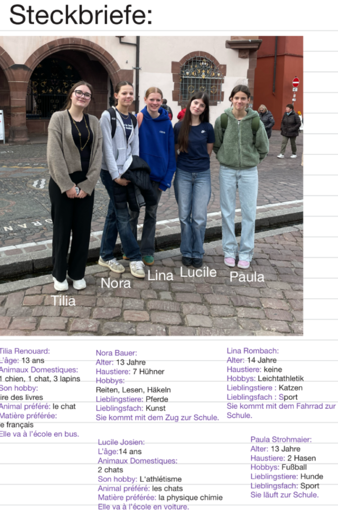 Wir sind Emma Lehner (8d), Eliza Meyer (8d), Sophie Weber (8d), Julia Stützlein (9c), Amelie Herbert (9c), Leeha Lamandé, Anaëlle Laurgeau sowie Alyah Hamelin (Austauschpartnerinnen) und wir werden in unserem Interview über das Schuleben in den beiden Ländern sprechen.