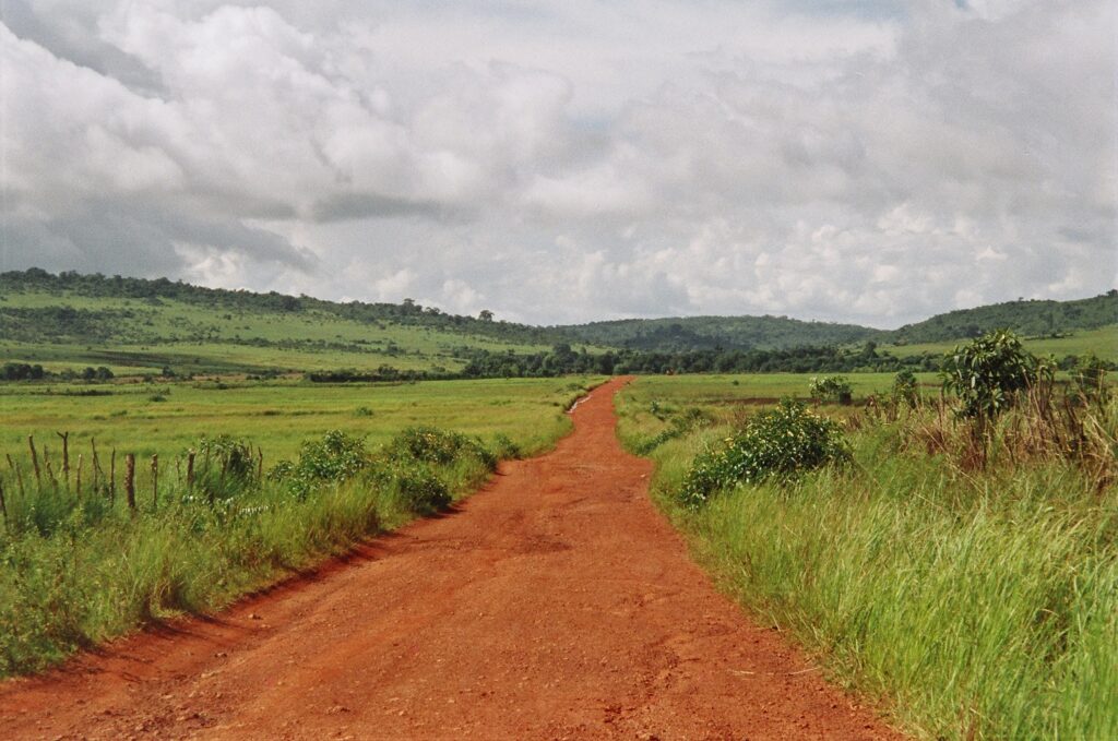 Ein guineanischer Highway. Besonders während der Regenzeit kann das eine schöne Schlammschlacht werden. Der rötliche Boden kommt durch die eisenhaltige Erde zustande.