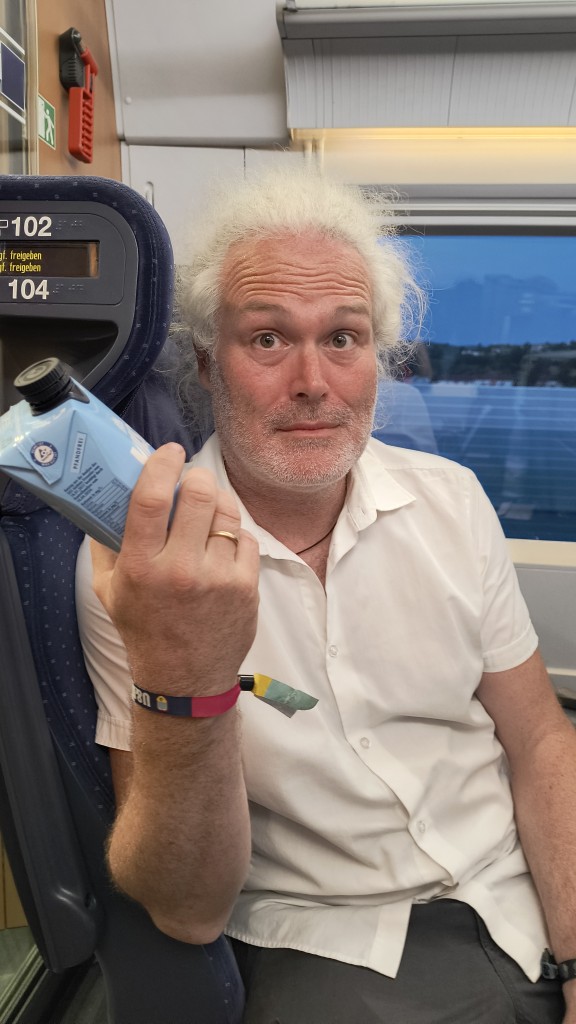 Und dann brausten wir doch los, bis wir dann wieder nicht mehr brausten und stattdessen kurz hinter der Berliner Stadtgrenze auf freiem Feld wieder einmal anhielten. Diesmal war es der Blitz, der blitzschnell den ICE stoppte. Wir waren so begeistert, auch weil immer wieder der pure Nervenkitzel in Form von schwer verständlichen, aber schaurig schönen Durchsagen in unser Ohr drang: „Man kann nichts sagen, one hour, two hours oder nur 5 Minuten.“ Irgendwann war das “Feuer” (?!) gelöscht und wir rollten wieder – zurück. Klar, erst erwarteten wir, dass es vielleicht einfach noch einmal von ganz vorne anfangen könnte, aber unberechenbar, wie die Bahn nun mal ist, änderte sie doch wieder die Richtung. Und hey – diesmal gab es etwas, keine Currywurst, aber ein schönes Tetrapak Wasser. Da haben wir uns erst richtig gefreut.