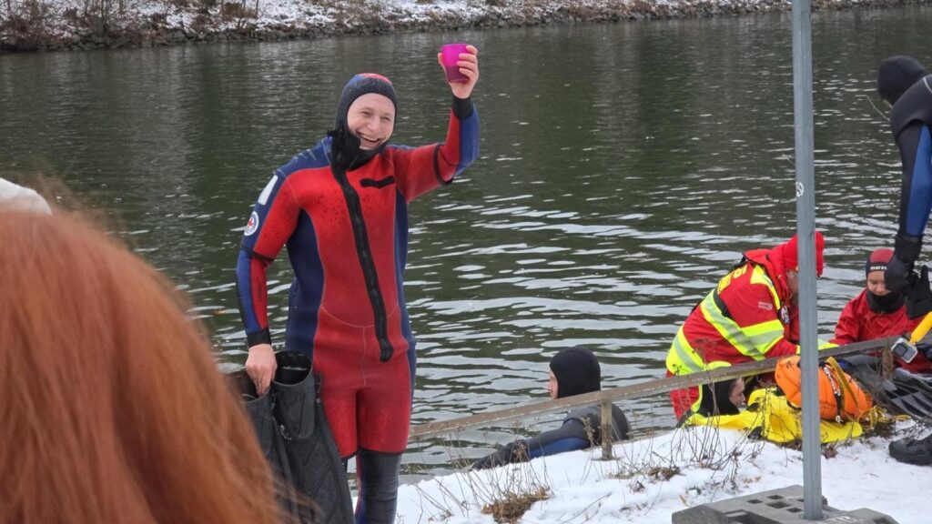 Letzter Ferientag. Während andere den Wecker ignorieren und sich nochmal im Bett umdrehen, stehe ich im Neoprenanzug am Main. Es ist kalt, es schneit leicht – und gleich gehe ich freiwillig ins unter ein Grad kalte Wasser.