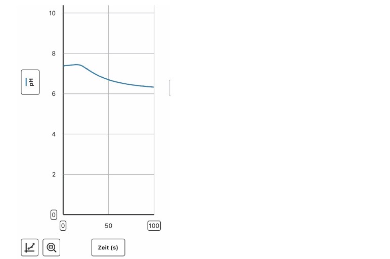 Für das Problem der Übersauerung haben wir einen Versuch durchgeführt. Wir haben Salz in Wasser gelößt, um Meerwasser zu Simulieren. Wir haben dann CO2 hinzugefügt, um die Veränderung des pH-Werts beobachten zu können. Aufgezeichnet haben wir dies mit dem Programm „Graphical“. Wir können eine klar, abfallende Kurve erkennen. Diese Erkenntnis beweist unsere Recherche und zeigt, welchen Einfluss CO2 auf das Meerwasser hat. Der pH-Wert sinkt von ca. 7,5 auf ca. 6,4.