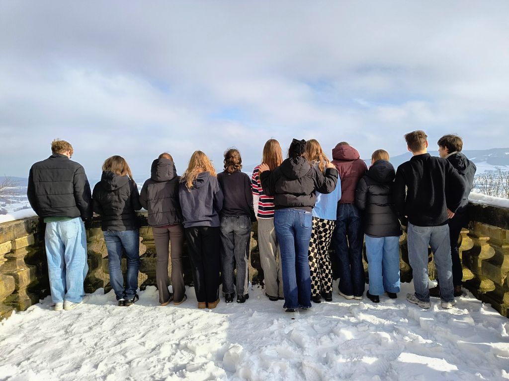 Bevor wir losfahren, müssen wir unseren Klassenkameraden natürlich noch viel Spaß in der Schule wünschen. Wir sehen zu wie sie ganz vorbildlich und pünktlich durch den Schnee zur Schule stapfen, um ihre Hirne einen weiteren Tag traktieren zu lassen. Ganz so pünktlich wie die Schüler ist der Zug leider nicht, ganze 9 Minuten Verspätung. Zum Glück haben wir genug Puffer eingeplant!