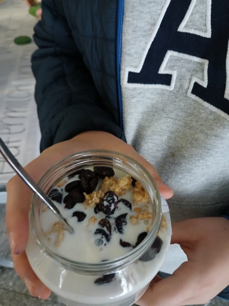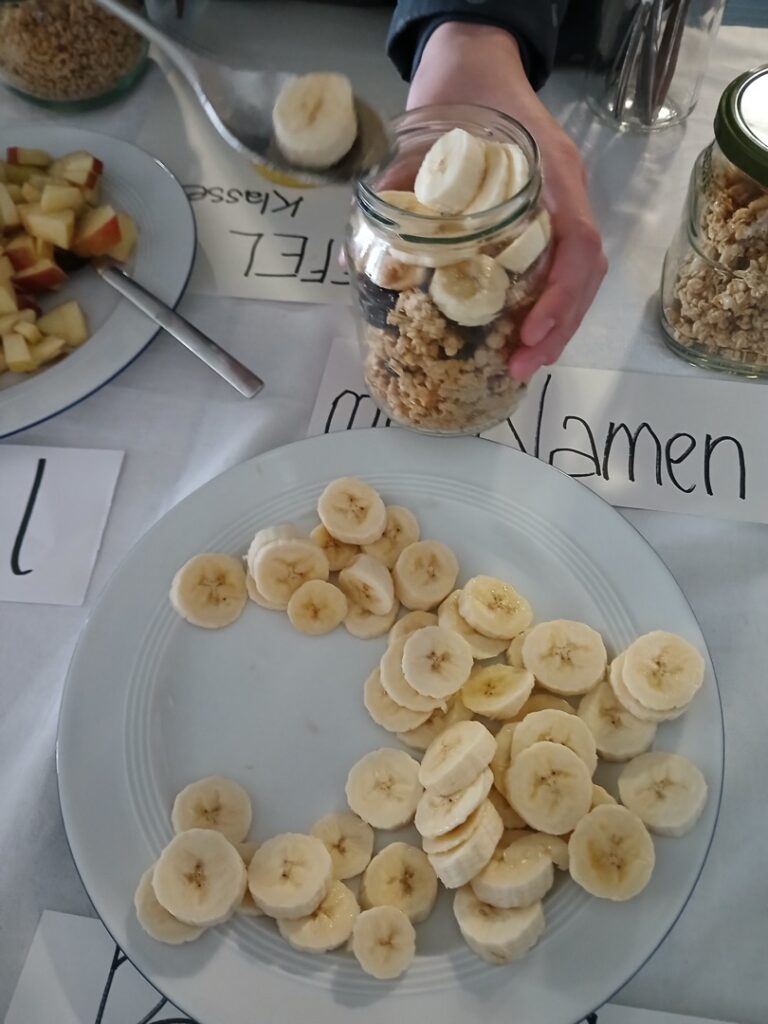 Also hat sich das Fairtradeteam ein paar Gedanken gemacht und in Kooperation mit Fresh&Fruits die Müsli-Aktion geplant. Bis letzten Freitag konnte man sein wiederverschließbares Glas, mit Namen, Klasse und 1,50€ im Werkraum abgeben. Dann hieß es nur noch das Wochenende abwarten und am Montag konnte man die gefüllten Gläser abholen und mit Milch und Obst toppen und es sich schmecken lassen.