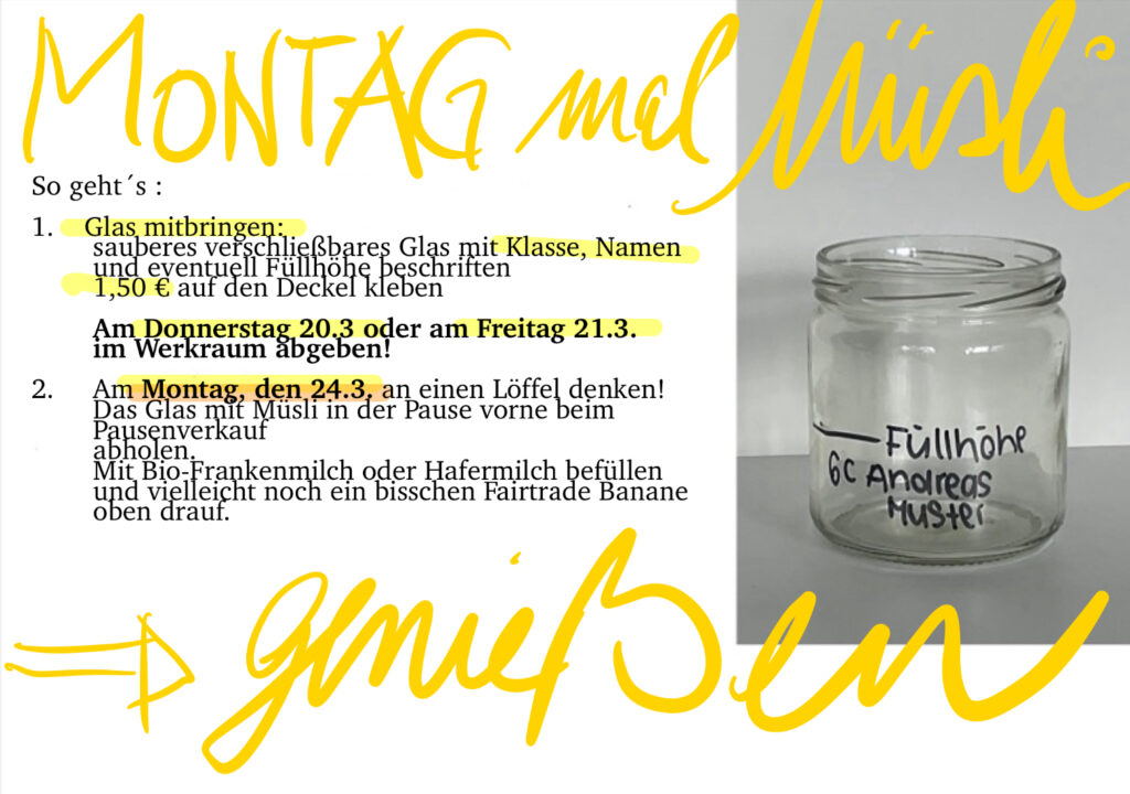 Habt ihr euch am Montag gewundert, warum auf einmal Schüler mit Müsli gefüllten Marmeladengläsern in den Pausen an euch vorbeilaufen, und euch die Frage gestellt: Woher haben sie das denn? Oder was hab’ ich denn jetzt schon wieder verpasst? Dann könnt ihr hier ganz schnell noch nachlesen, was denn am Montag überhaupt los war.