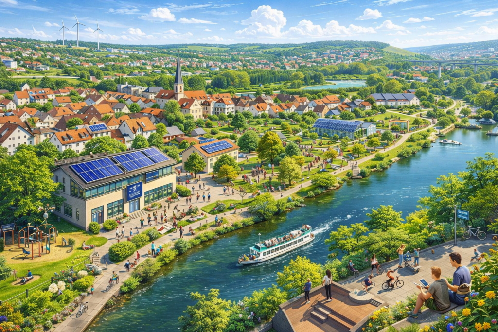 Das Bild zeigt meine Vision eines lebendigen, nachhaltigen und gemeinschaftlichen Veitshöchheims. Im Mittelpunkt stehen der Main als Begegnungsraum, sichere Wege für Fußgänger und Radfahrer sowie grüne Uferflächen, die zum Verweilen einladen. Moderne Gebäude mit Solaranlagen symbolisieren nachhaltiges Bauen, bezahlbaren Wohnraum und eine innovative lokale Wirtschaft. Kleine Betriebe, Handwerk und Dienstleister sind bewusst in das Ortsbild integriert und bieten Ausbildungs- und Arbeitsplätze für junge Menschen vor Ort. Menschen aller Generationen nutzen Freizeit-, Kultur- und Sportangebote und begegnen