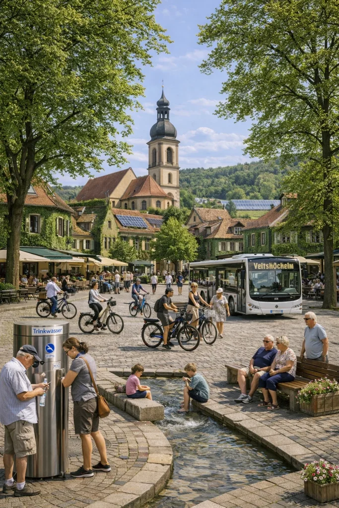 Veitshöchheim sieht in einer nicht allzu fernen Zukunft auf den ersten Blick nicht allzu verschieden aus zu heute. Es ist mittlerweile etwas weitergewachsen und der Ortskern ist belebter, auch außerhalb der Urlaubszeit. Trotzdem herrscht gemütliches Treiben, ohne zu große Unruhe, da nur Fahrradfahrer, Fußgänger und Busse sich aneinander vorbei schlängeln. Der öffentliche Raum lädt zum Verweilen ein dank der kühlenden Bäume und gemeinsamer gestalteter Lieblingsorte. Besonders an den heißesten Tagen freut sich jeder über die öffentlichen Trinkwasserspender, die seit einer Weile überall zu finden sind. Veitshöchheim wäre ein Ort an dem sich Jung wie Alt begegnet und austauscht. So entstehen weiter ganz natürlich kreative Lösungen für immer neue Herausforderungen. Dabei spielt das Bewahren von Erreichtem eine ebenso wichtige Rolle wie der Einzug unverzichtbarer Veränderungen. So wäre der Anblick Veitshöchheims zwar noch vertraut, aber allerorts wären regenerativer Energiequellen und Speicher zu finden, auf die man stolz ist da Teil einer eigenen Bürgerenergie.