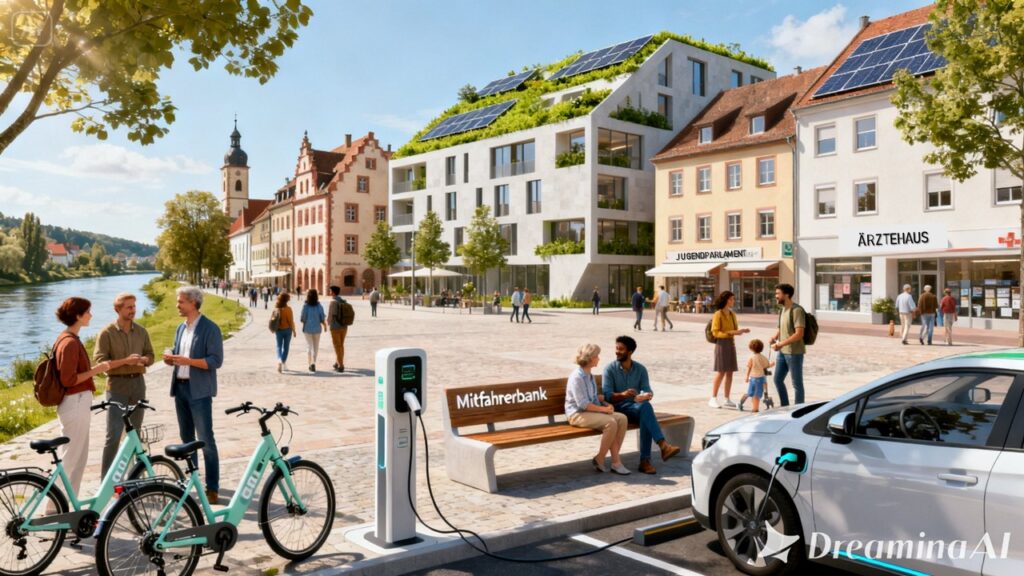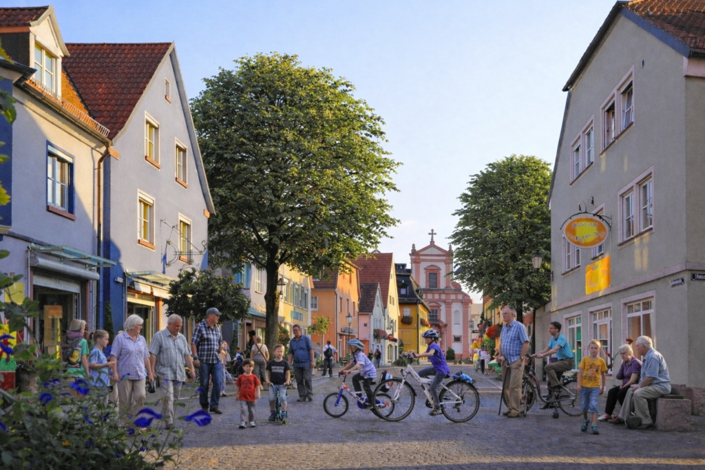 sich im öffentlichen Raum. Digitale und moderne Verwaltungsgebäude symbolisieren eine bürgernahe, effiziente Gemeinde mit kurzen Wegen. Gleichzeitig bleiben Natur, Landschaft und Ortsbild erhalten. Das Bild verbindet Tradition und Fortschritt und zeigt Veitshöchheim als Ort, an dem Gemeinschaft gelebt wird, Umwelt geschützt wird und Lebensqualität für Jung und Alt im Mittelpunkt steht.