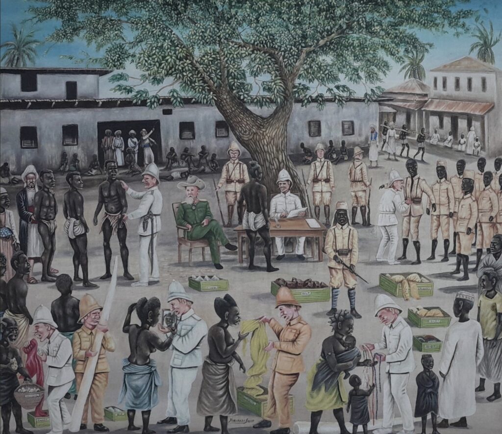 Mikidadi Bush, Kuingia kwa Wajerumani Bagamoyo (übersetzt: deutscher Einmarsch in Bagamoyo), https://tanzaniart.de/Gallery/
